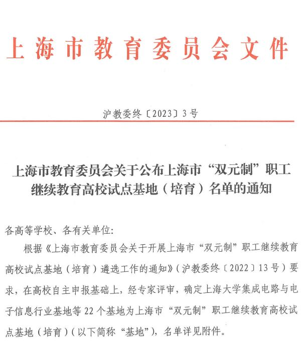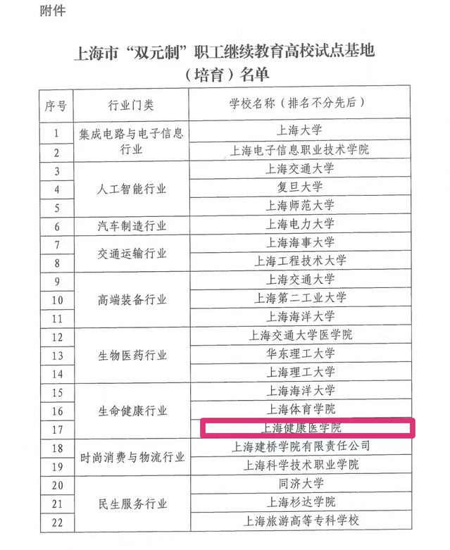 日前,从上海市教委获悉:经过申报和评审,公司遴选为上海市生命健康行业双元制职工继续教育高校试点基地。