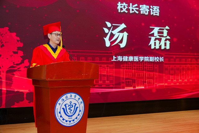 最后,汤磊为同学们送上毕业祝福和美好期许!他代表公司向毕业生们表示热烈祝贺;对尽心竭力、教书育人的老师们表示感谢;对于默默支持的家人们表示敬意!他赞扬同学们在大上海保卫战中最美逆行,敬佩同学们工作学习两手抓、两手硬。汤磊以习近平总书记寄语青年在新时代、新赛道上跑出加速度为指引,鼓励大家贯彻落实习近平新时代中国特色社会主义思想,不负韶华,不负时代,不负人民。他嘱咐同学们,正青春——青年要恪守岗位奉献,助力健康中国“扬帆”;护健康——青年要勇担复兴重任,推进健康中国“破浪”;启新程——青年要坚持终身学习,守护健康中国“远航”。他勉励同学们,要坚持时不我待的拼搏精神,要守住“厚德至善”的健康之训,要勇担“健行康民”的时代重任,不忘初心,砥砺前行!